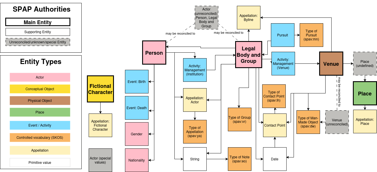 (english) This page documents the structure of the Authorities data published by the SAPA Foundation. This regroups in particular the persons, groups, geographical locations and the buildings related to performances. This model is mostly based on CIDOC-CRM. Please note the following specificities: