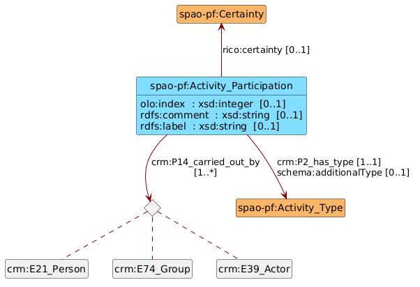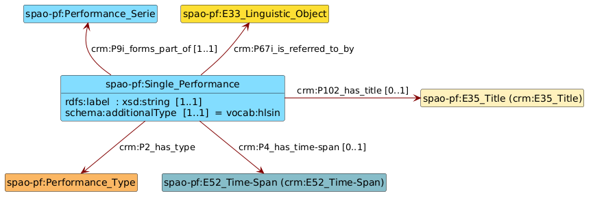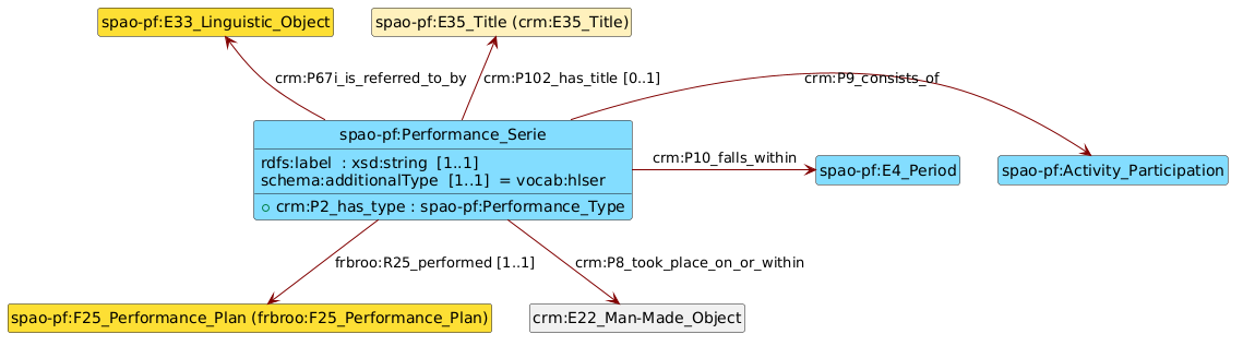 frbroo:F22_Self-Contained_Expression. The latter are not intended to be reconciled or completed. For example, they do not have any labels.frbroo:F20_Performance_Work and frbroo:F25_Performance_Plan are used in a very similar way. They model the creative and economic process that made the performance possible. It is not impossible that in the future they will be merged into a single entity of type lrmoo:F1_Work.schema:additionalType property.crm:E42_Identifier linked to ‘Performance Plans’ have so far only been used for internal management purposes within the SAPA Foundation. They serve to link to other databases maintained by the foundation.crm:E62_String in the future.(français) Cette page documente le modèle de données utilisé par la Fondation SAPA (Suisse) pour modéliser les entités spécifiques aux arts de la scène. Y sont modélisées en particulier les productions, les séries de représentations, les représentations individuelles, les représentations isolées, les saisons et les captations. Ce modèle est principalement basé sur les ontologies FRBRoo et CIDOC-CRM. Il faut aussi bien noter les aspects suivants :