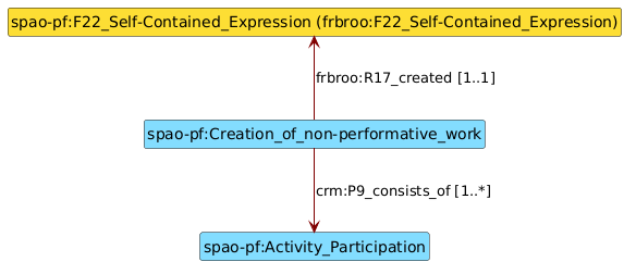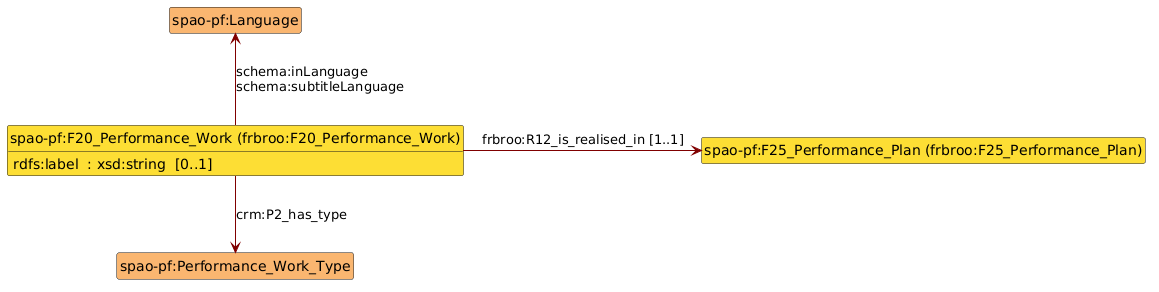 frbroo:F22_Self-Contained_Expression. Ces dernières n’ont pas vocation à être réconciliées ou complétées. Elles ne disposent par exemple d’aucun libellé.frbroo:F20_Performance_Work et frbroo:F25_Performance_Plan sont utilisées dans une compréhension très proche. On y modélise le processus créatif et économique qui a rendu possible le spectacle. Il n’est pas impossible qu’à l’avenir elles soient fusionnées au sein d’une même entité de type lrmoo:F1_Work.frbroo:F31_Performance. Leur distinction est signalée via un vocabulaire contrôlé utilisé avec la propriété schema:additionalType.crm:E42_Identifier liées aux «Performance Plan» n’ont qu’une vocation de gestion interne à la Fondation SAPA jusqu’ici. Elles servent à faire le lien vers d’autres bases de données maintenues par la fondation.crm:E62_String à l’avenir.