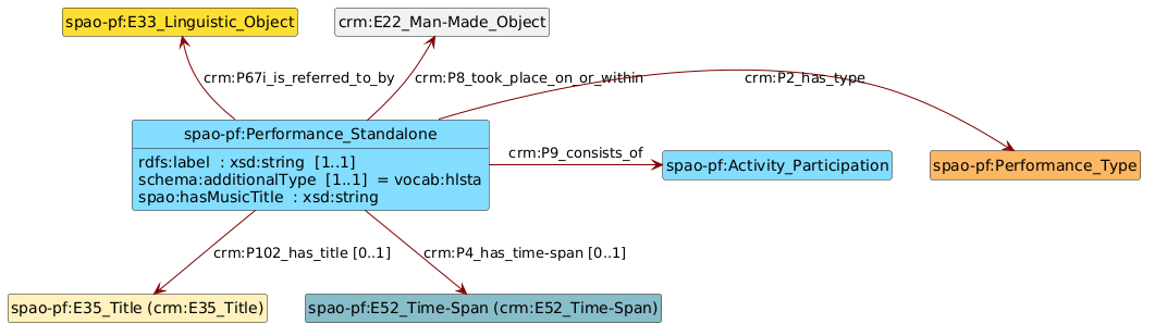 (english) This page documents the data model used by the SAPA Foundation (Switzerland) to model entities specific to the performing arts. In particular, it models productions, performance series, individual performances, standalone performances, seasons and recordings. This model is mainly based on the FRBRoo and CIDOC-CRM ontologies. The following aspects should also be noted: